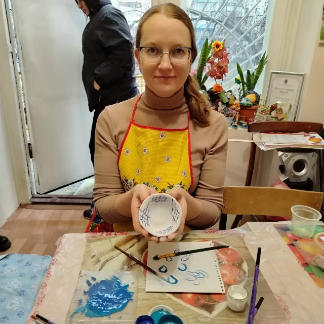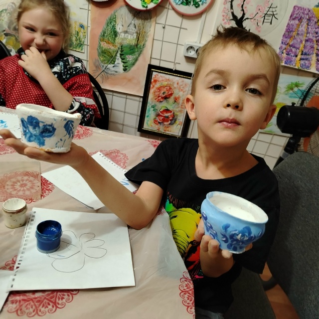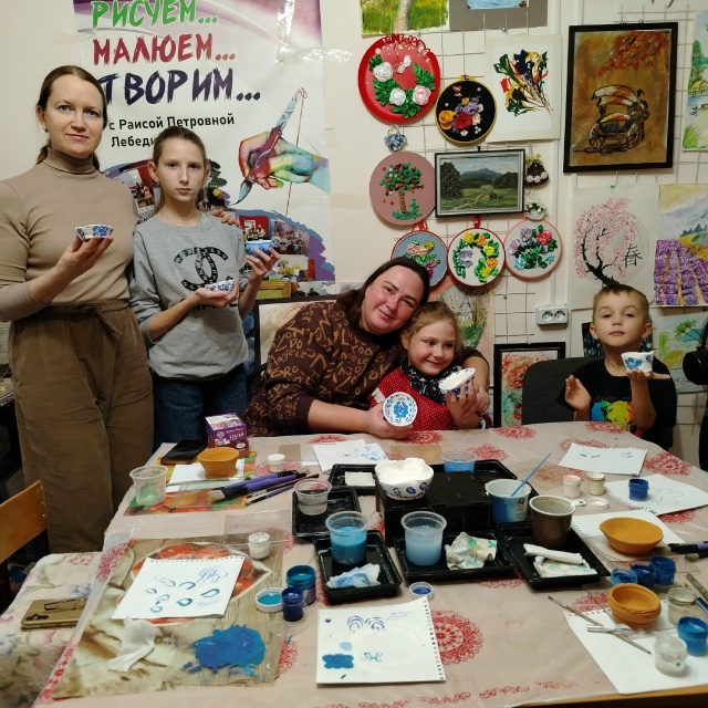 На очередном занятии с нашим прекрасным художником Раисой Петровной Лебединец расписывали глиняную посуду в стиле Гжель. Работали и мамы и дети. Все получили удовольствие. А потом всех угостила конфетками.